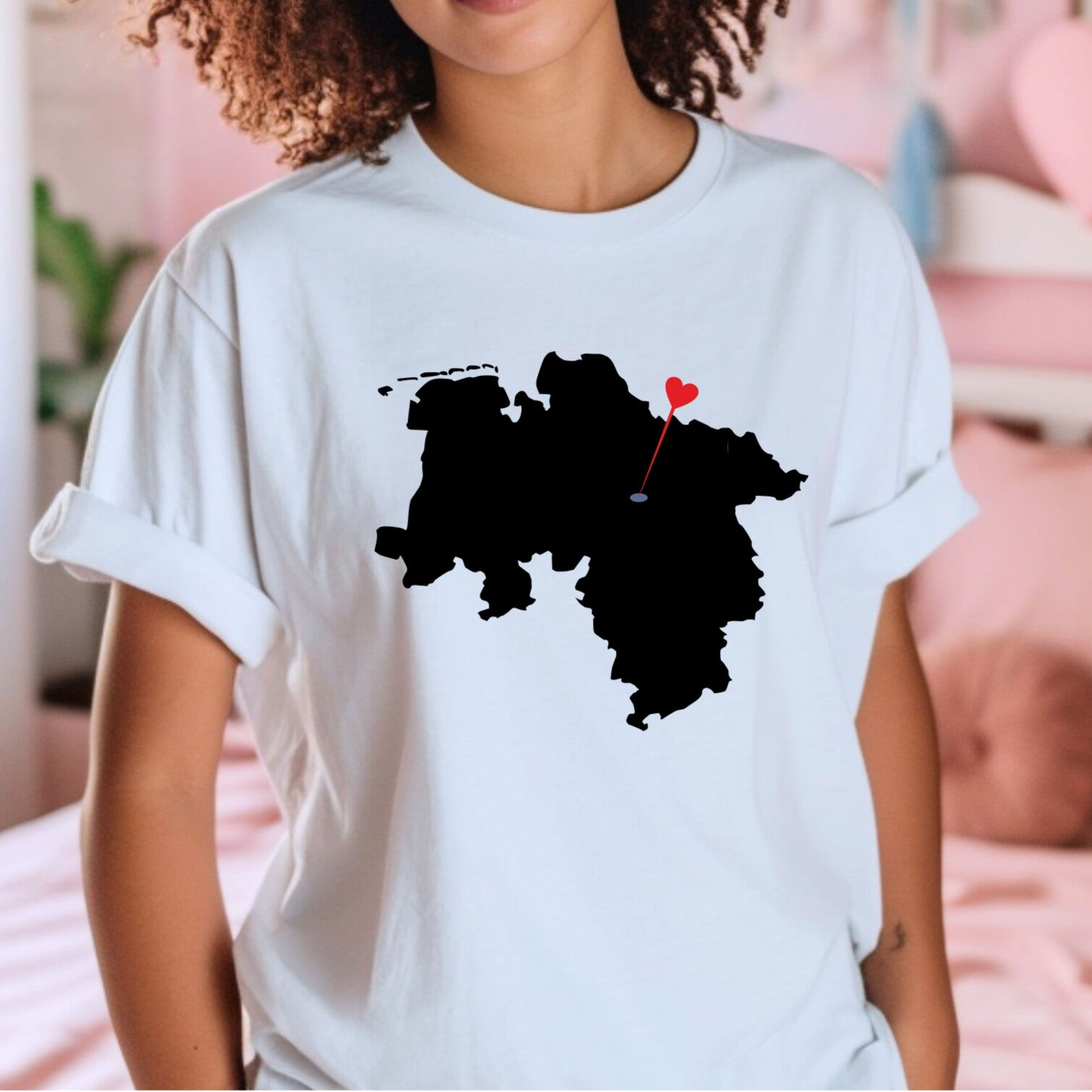 Dieses individuell gestaltbare T-Shirt zeigt dein Bundesland als Umriss oder in flächigem Schwarz – mit deinem Heimatort markiert durch ein kleines Fähnchen. Ob du deinen Ursprung feiern willst, ein Stück Zuhause immer bei dir tragen oder einfach ein einzigartiges Geschenk suchst – dieses Shirt vereint minimalistisches Design mit persönlicher Bedeutung.