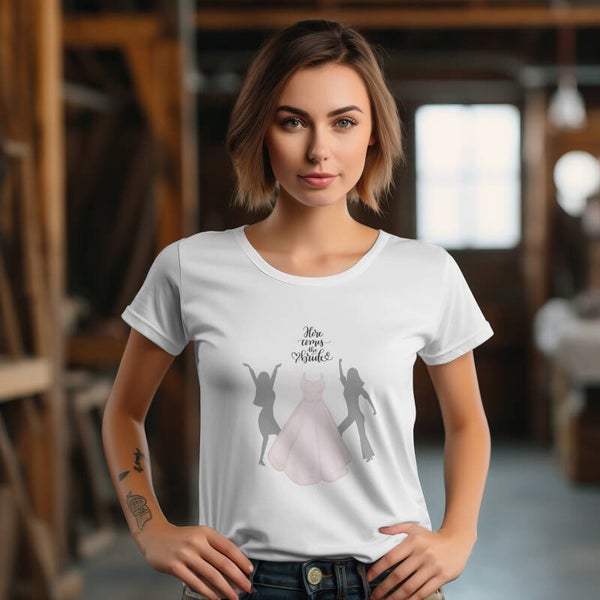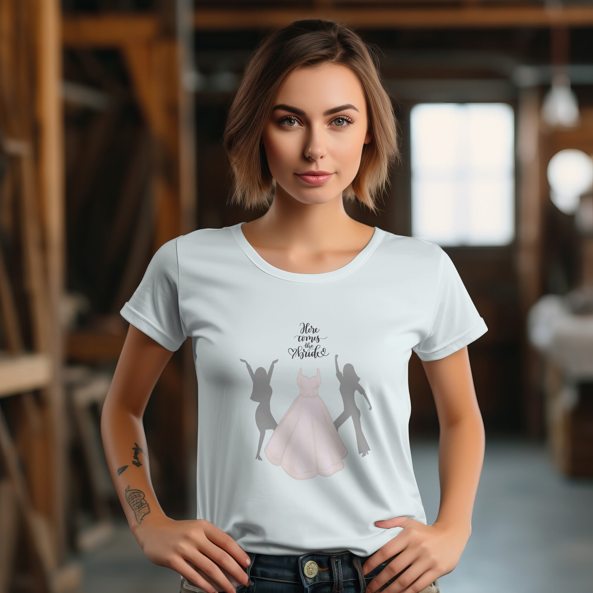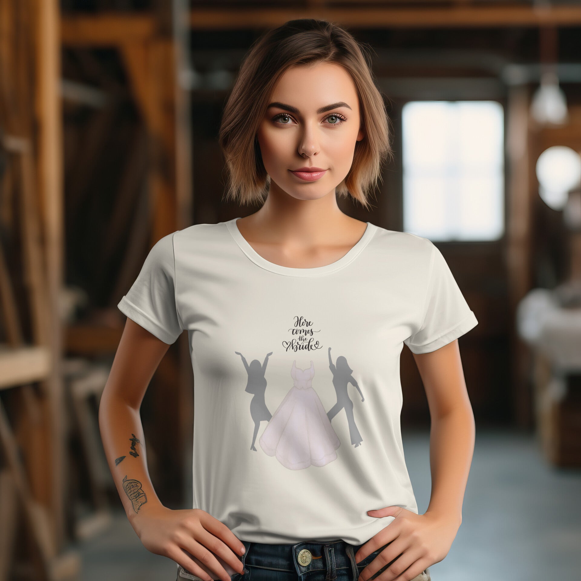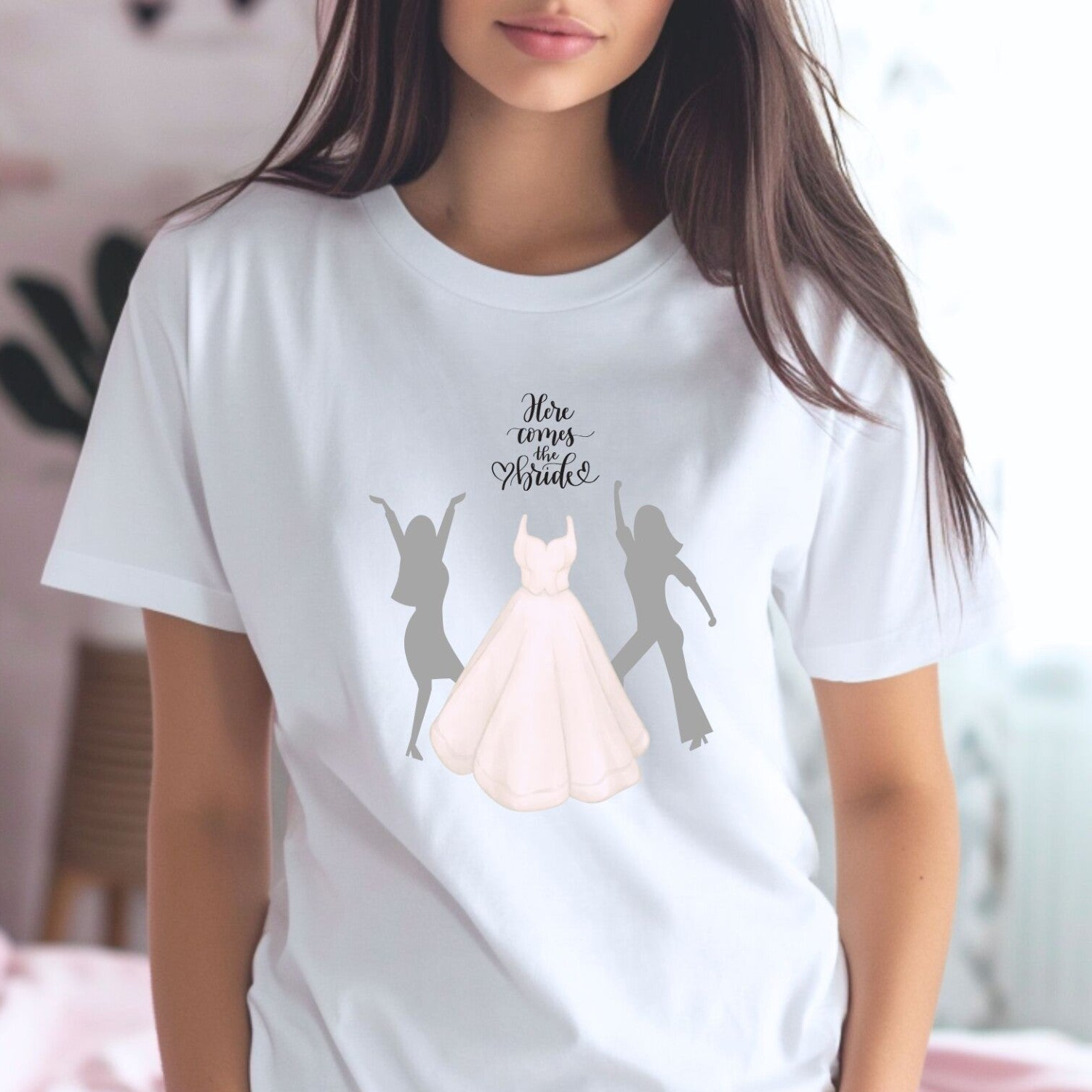 Bride T-Shirt – Kleid-Motiv mit Aufschrift „Here Comes the Bride“