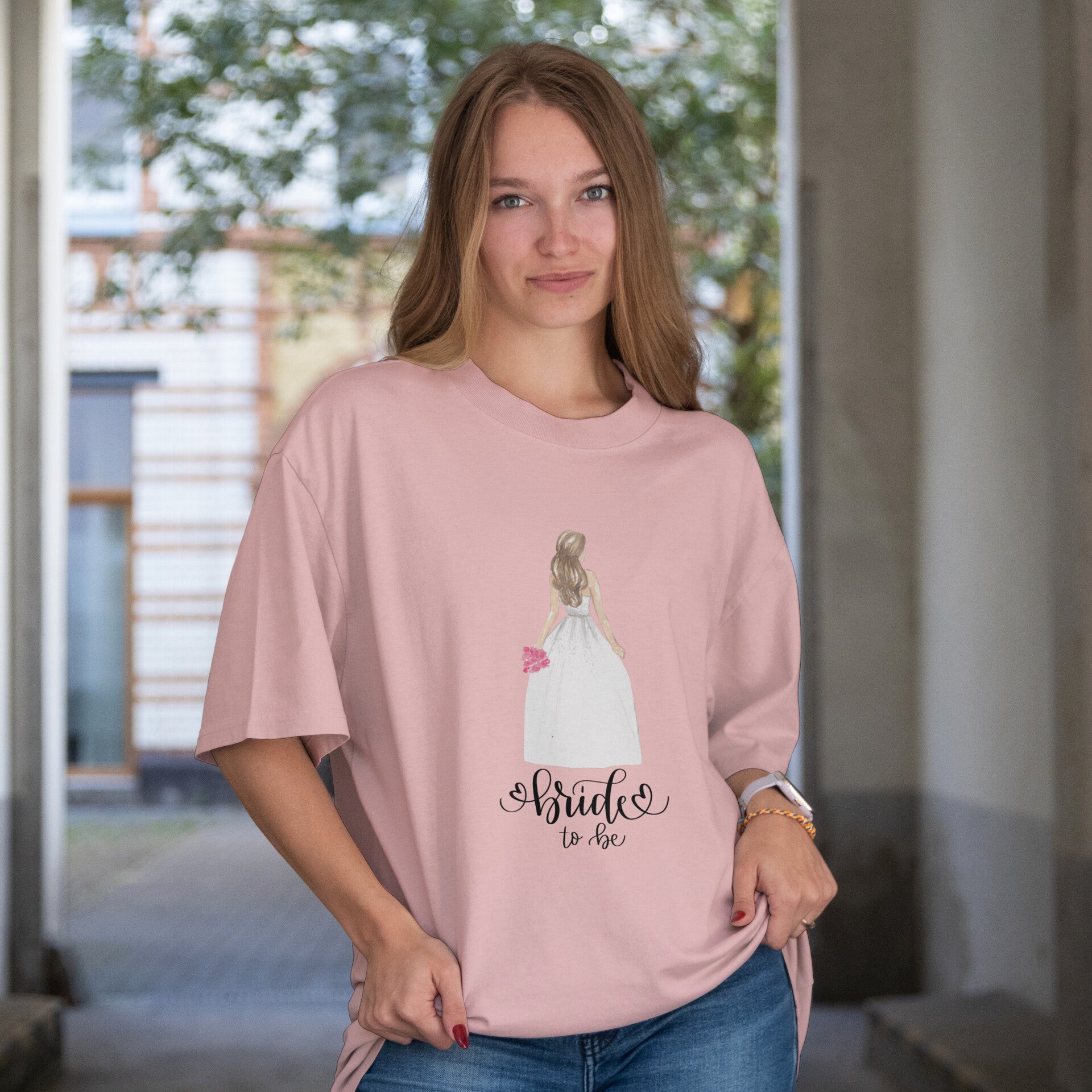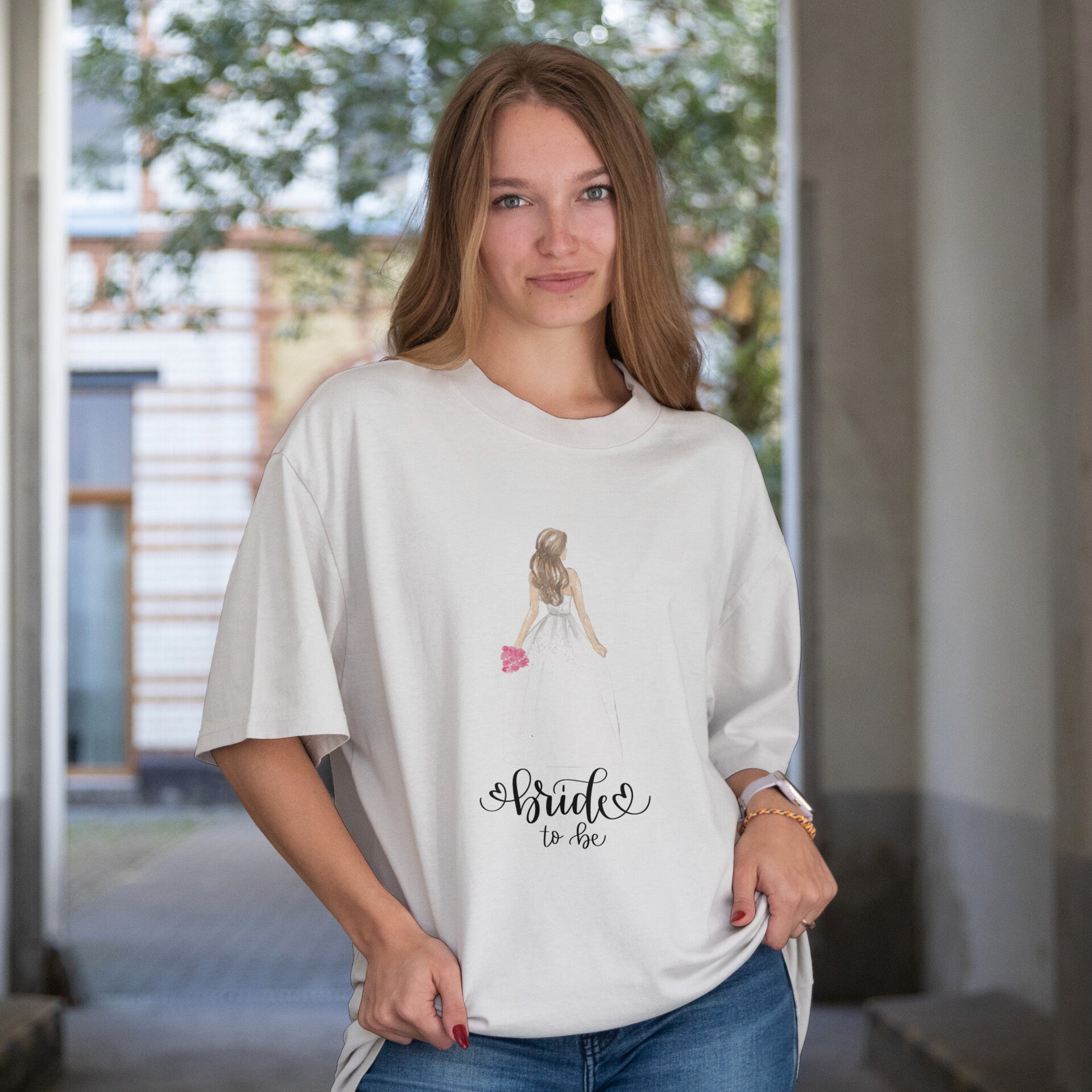 Dieses stilvolle Bride to Be T-Shirt ist der Hingucker für jeden Junggesellinnenabschied! Das Design zeigt eine elegante Braut von hinten mit Blumenstrauß in der Hand – ein wunderschönes Symbol für die Vorfreude auf den großen Tag. Der Schriftzug „Bride to Be“ rundet das romantische Design perfekt ab.
