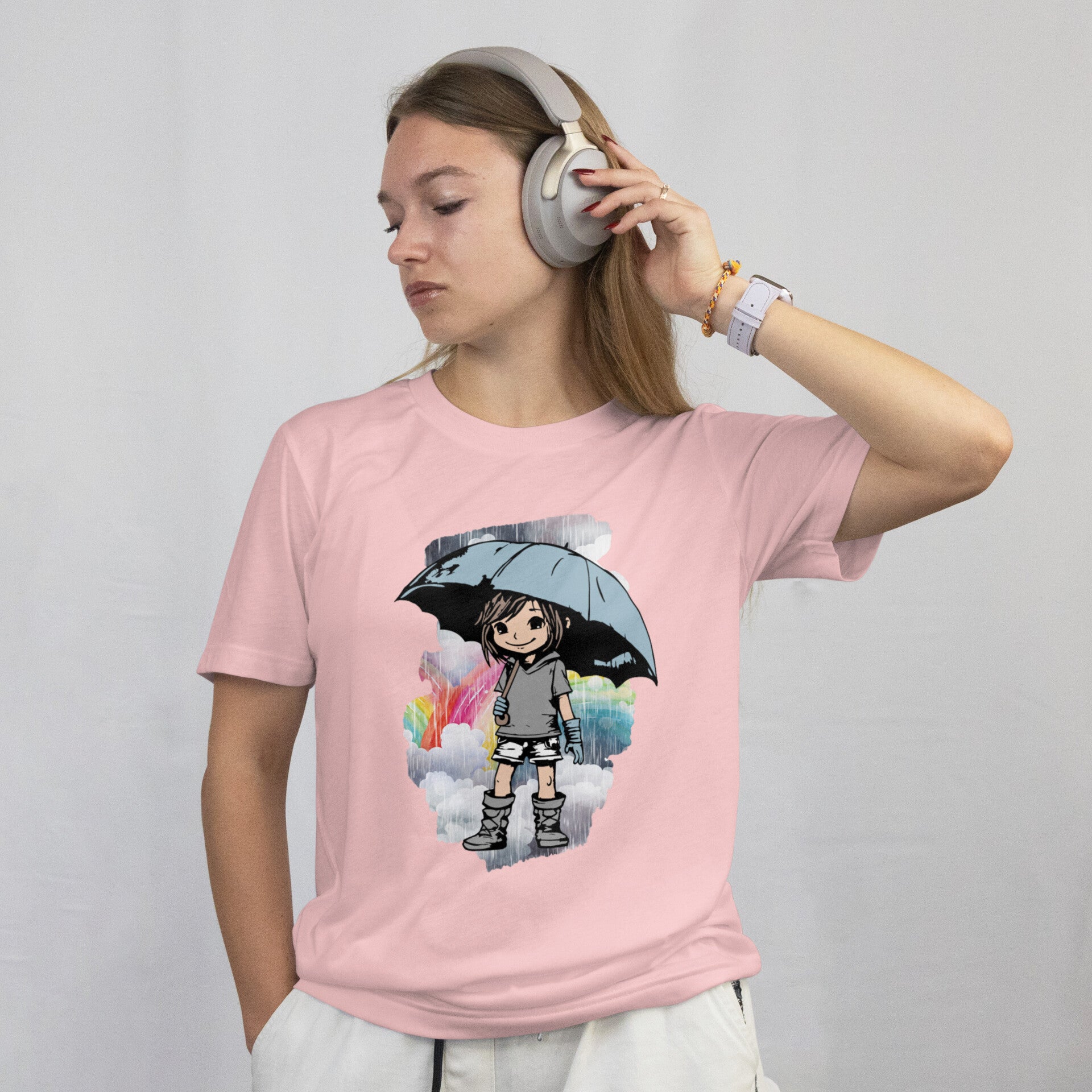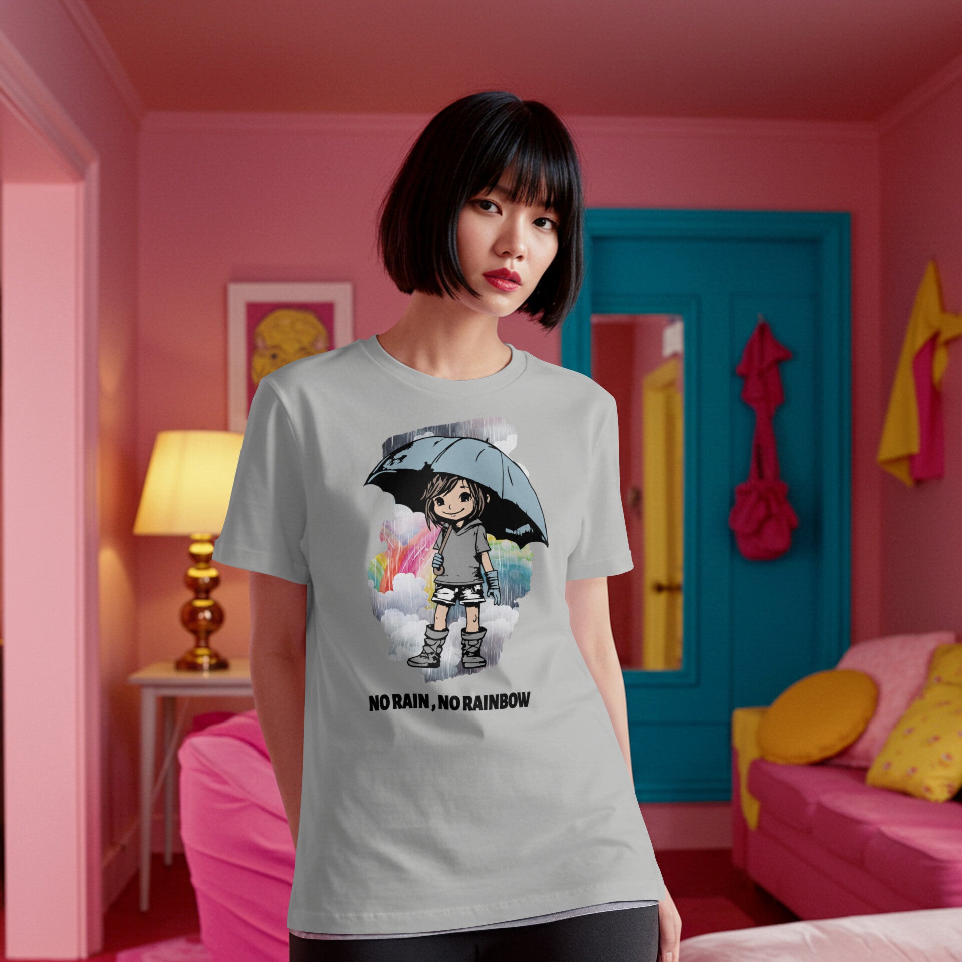Dieses hochwertige T-Shirt mit dem inspirierenden Spruch „No Rain No Rainbow“ zeigt ein stilvolles Motiv: ein Mädchen mit Regenschirm, das Wind und Wetter trotzt – Symbol für Hoffnung, Stärke und positive Energie. Perfekt für alle, die auch in schweren Zeiten den Regenbogen sehen wollen.