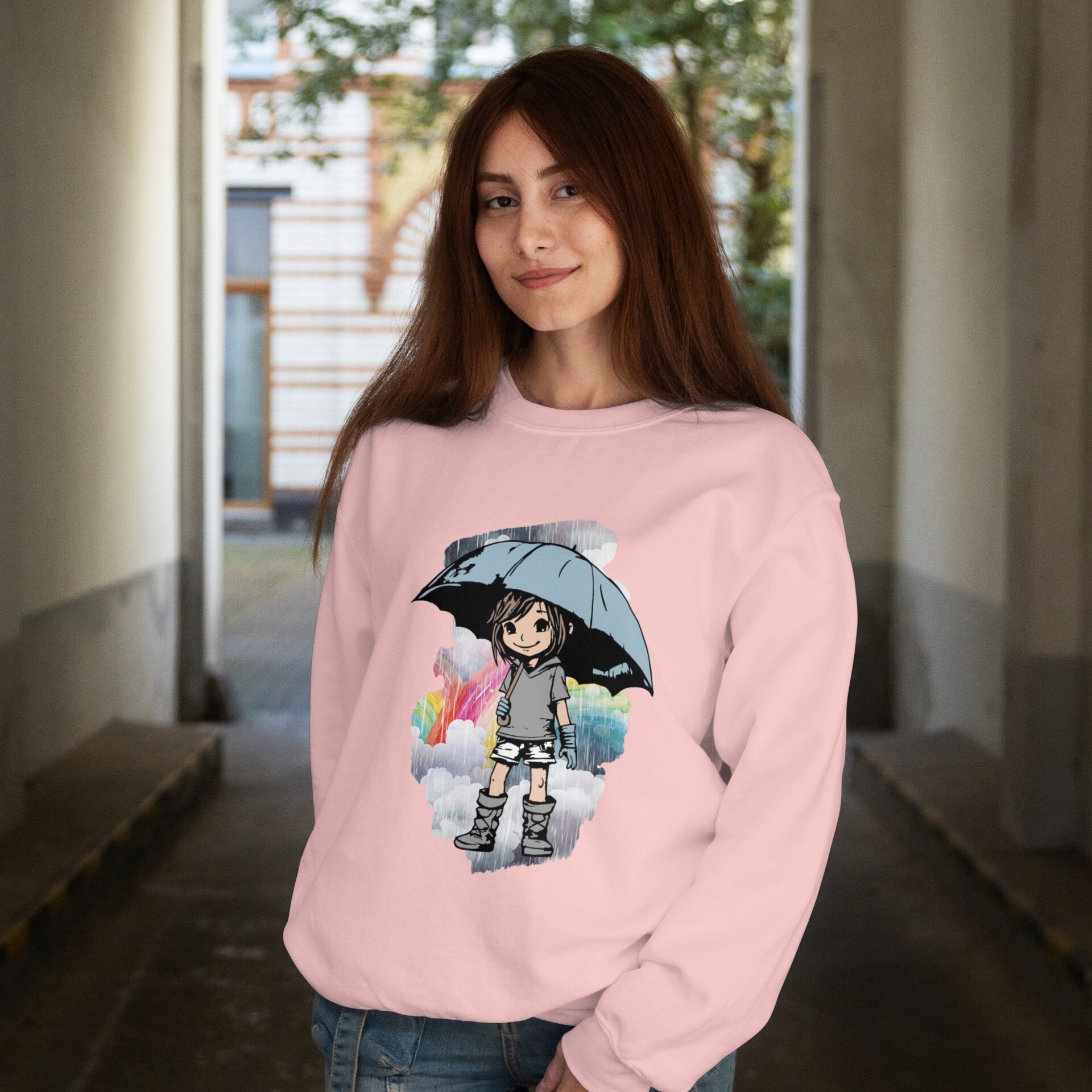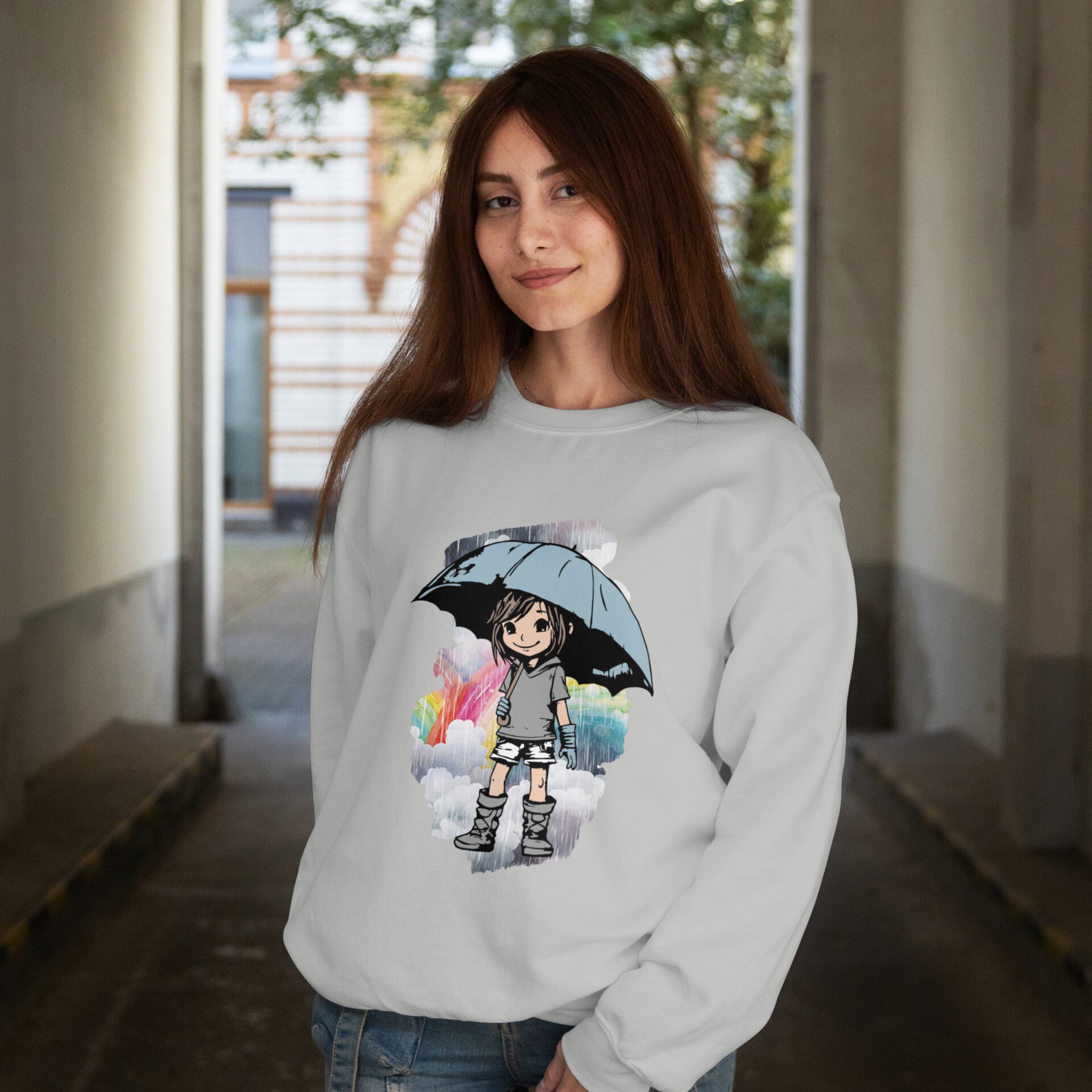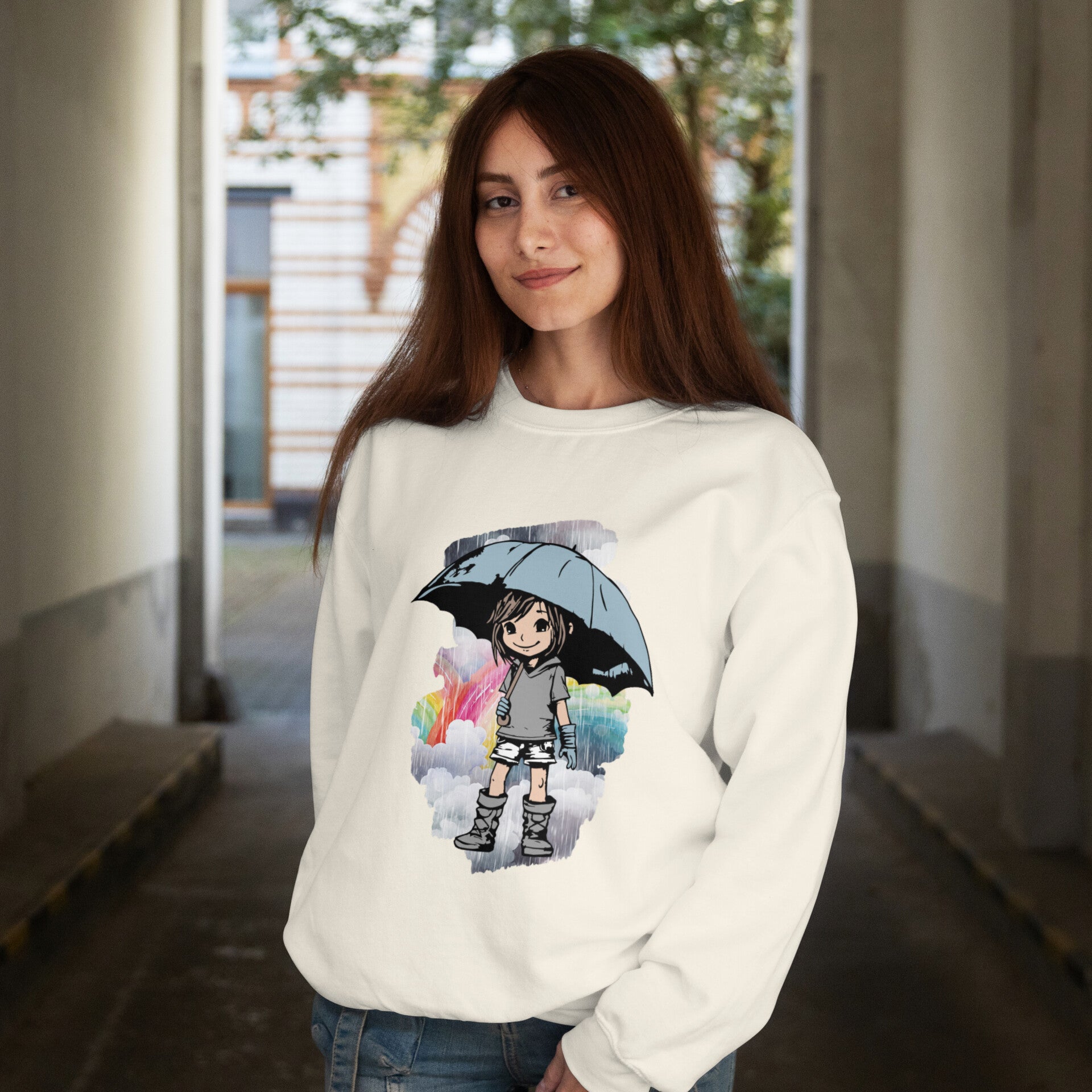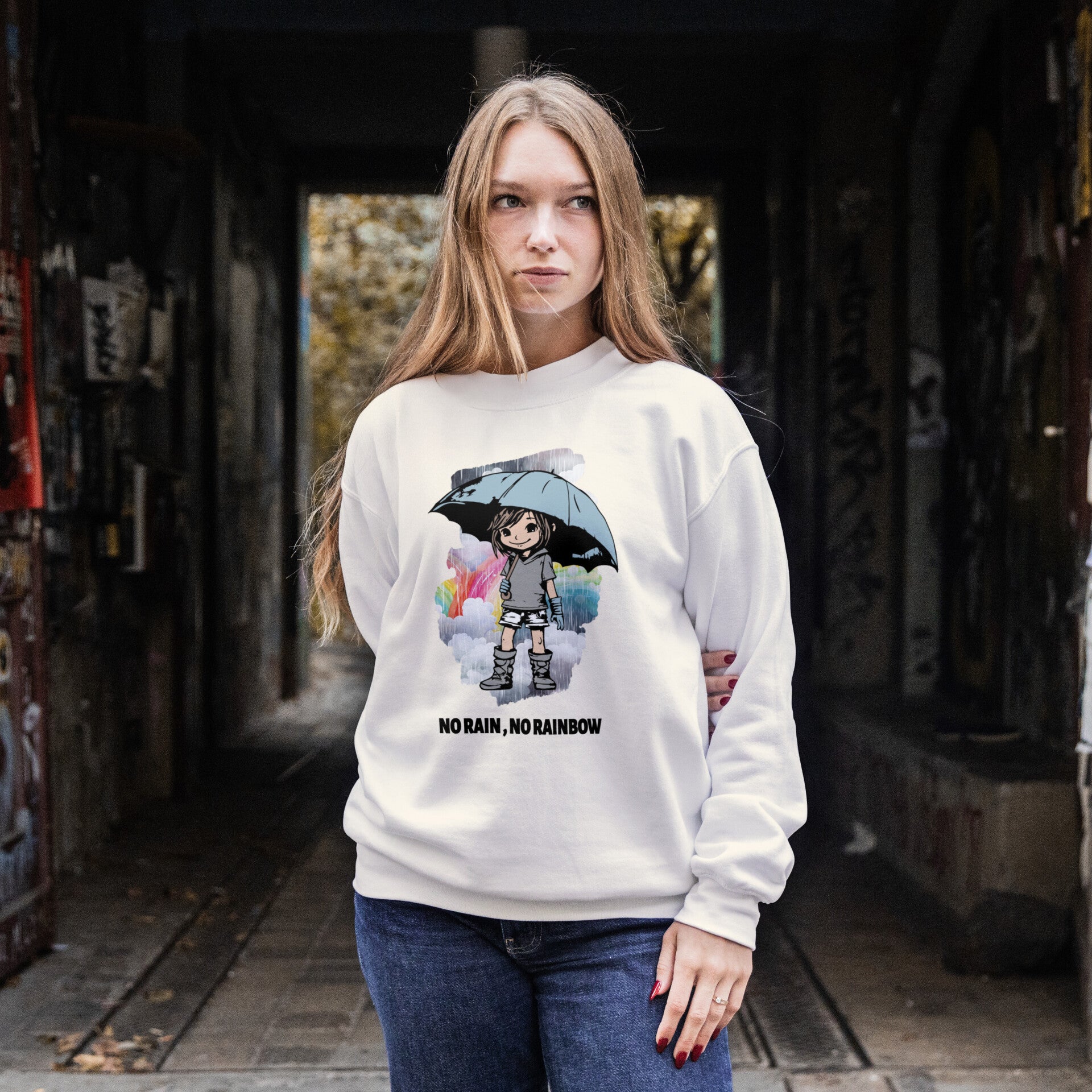Dieses stilvolle Sweatshirt mit dem Spruch „No Rain No Rainbow“ verbindet kuscheligen Komfort mit einer positiven Botschaft. Das Design zeigt ein verträumtes Mädchen mit Regenschirm – ein Symbol für Hoffnung, Mut und Optimismus nach jedem Sturm.