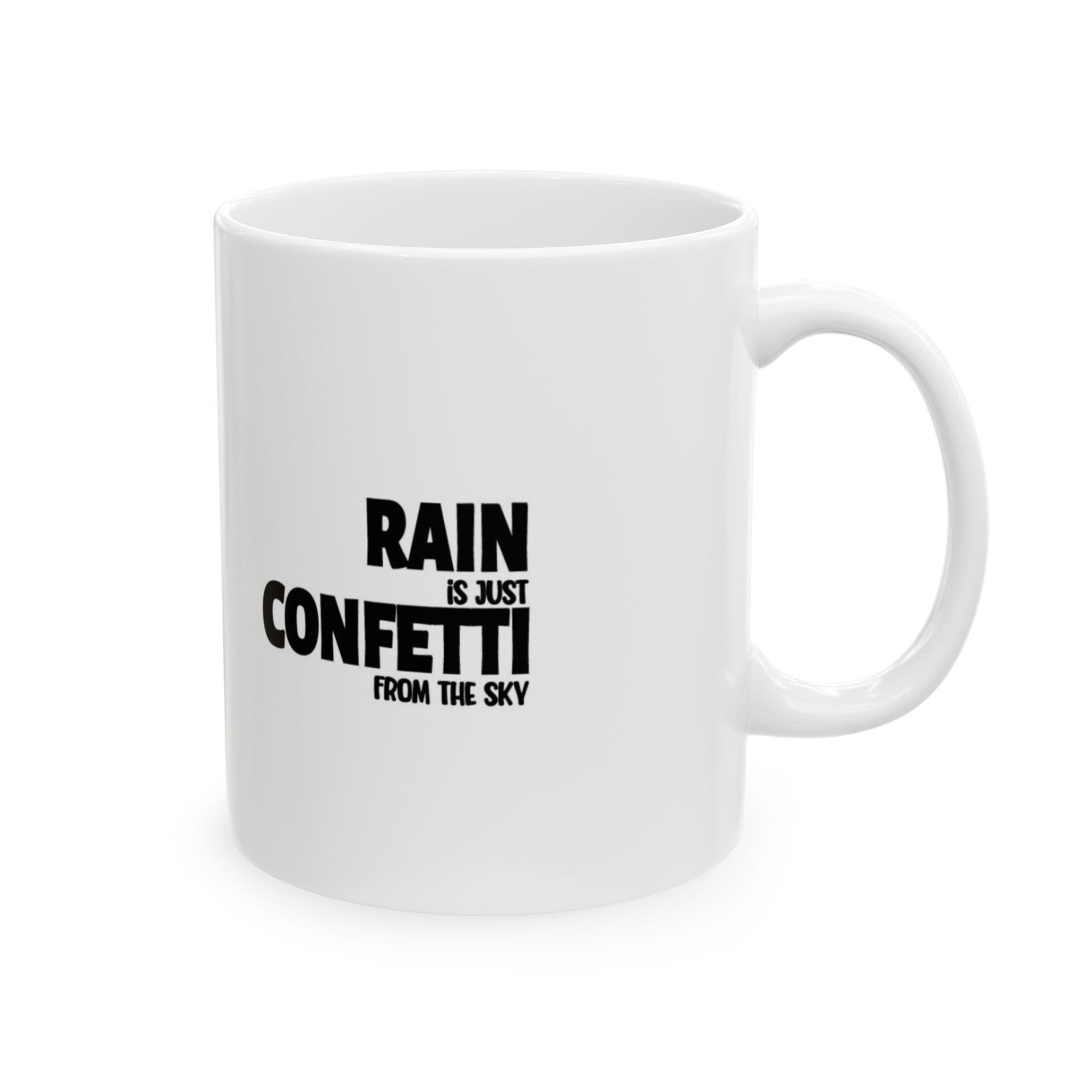 Diese liebevoll gestaltete Tasse mit dem Spruch „Rain is just confetti from the sky“ erinnert dich daran, das Positive zu sehen – selbst wenn’s mal grau ist. Die Illustration eines Mädchens mit Regenschirm macht die Botschaft noch stimmungsvoller und verleiht der Tasse einen verspielten, kunstvollen Look.