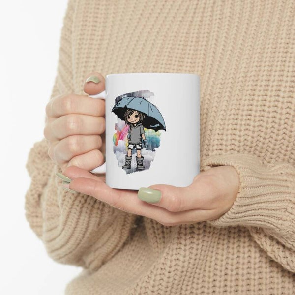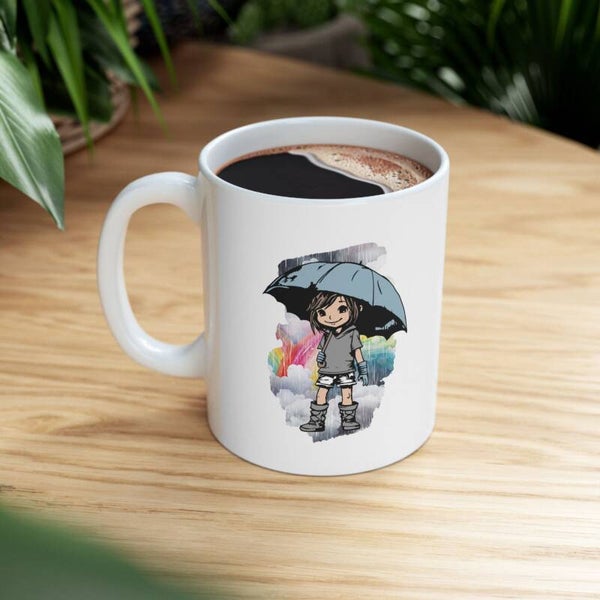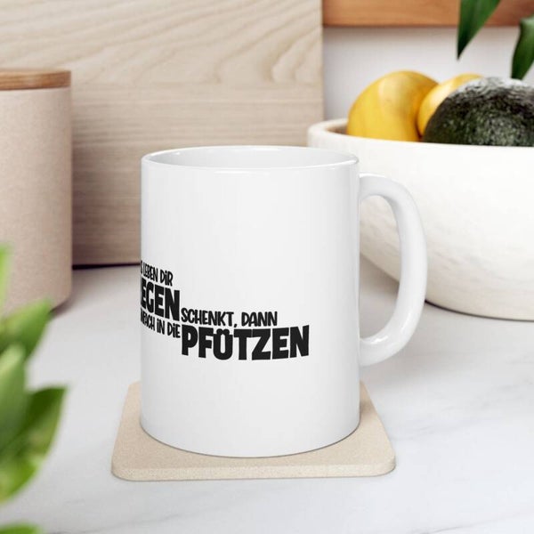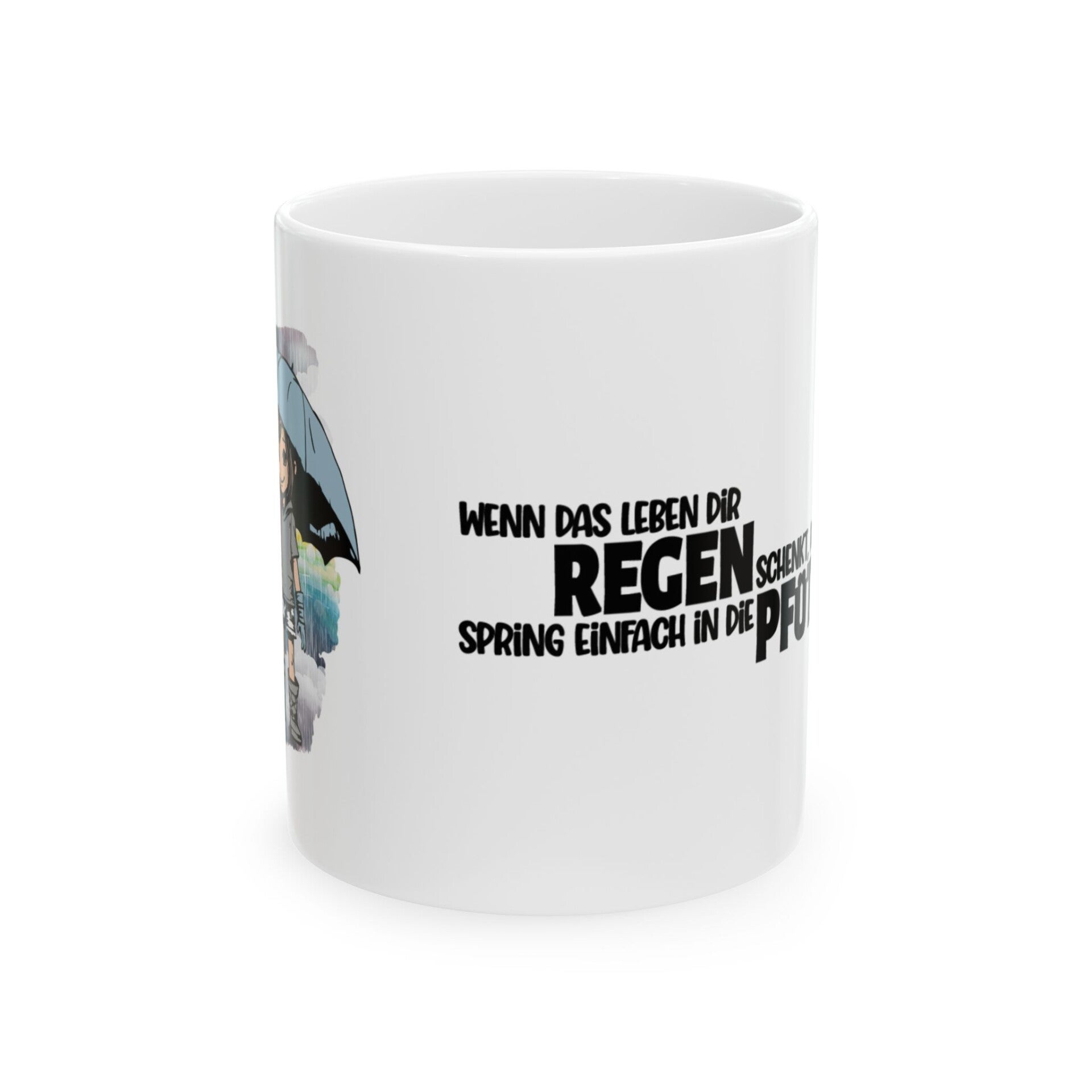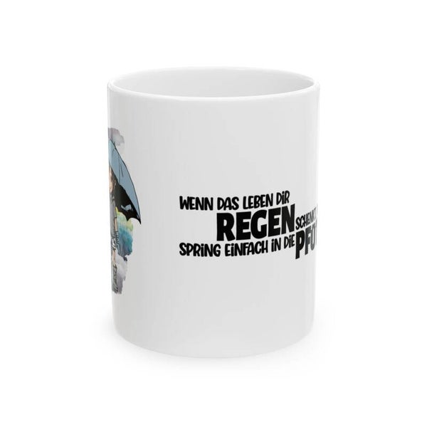 Unsere liebevoll gestaltete Tasse mit dem inspirierenden Spruch „Wenn das Leben dir Regen schenkt, spring in die Pfützen“ bringt Lebensfreude in jeden Schluck. Das zarte Regenmädchen mit Regenschirm unterstreicht die positive Botschaft und macht die Tasse zum perfekten Begleiter für deinen Morgenkaffee oder Tee.