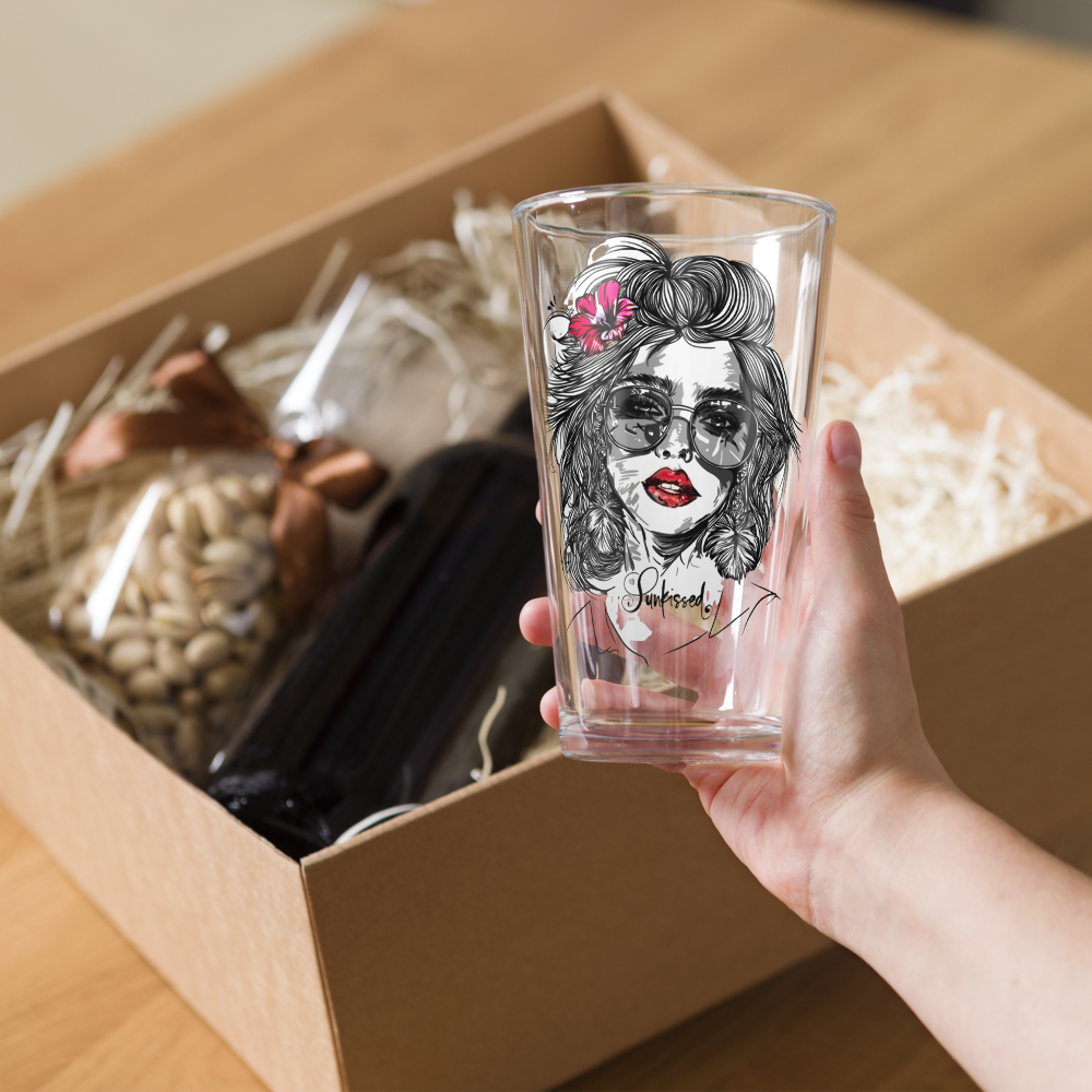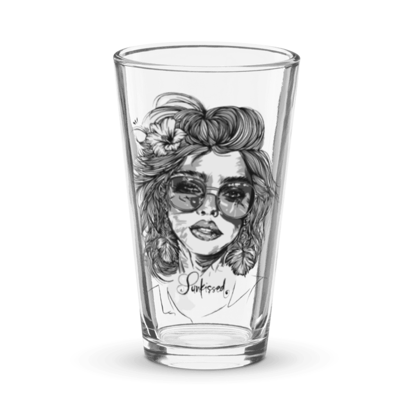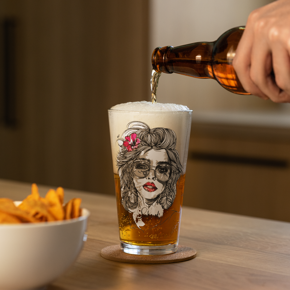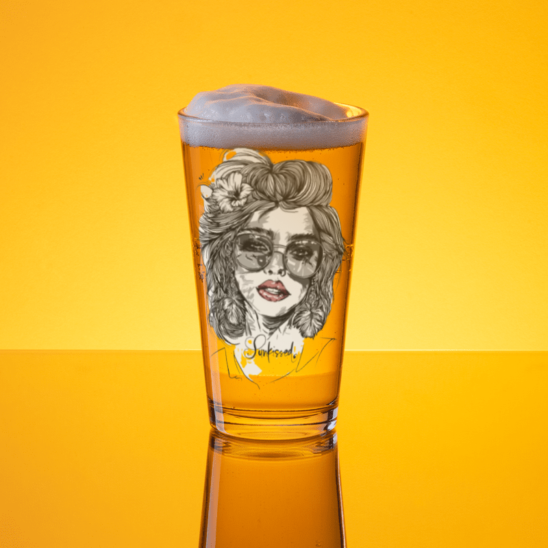 Verleihe deinen Drinks eine Extraportion Stil: Unser Pint Glass „Sunkissed“ präsentiert ein kunstvolles Motiv eines Frauenkopfes mit welligem Haar, Sonnenbrille, Kusssmund und Blume im Haar – optional mit roten Lippen und/oder roter Blume für einen individuellen Farbakzent.