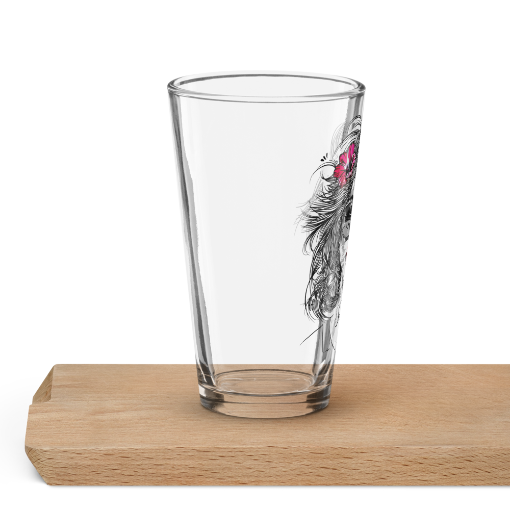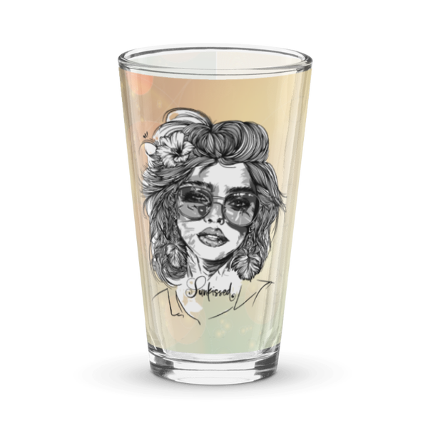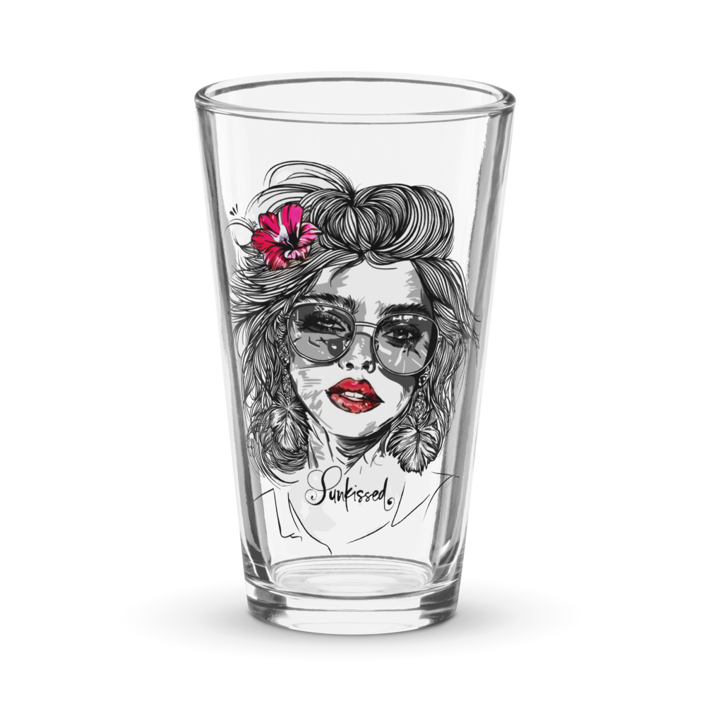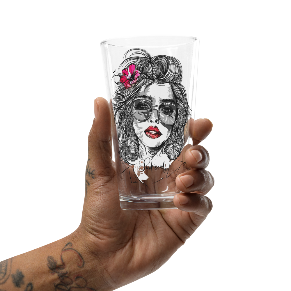 Verleihe deinen Drinks eine Extraportion Stil: Unser Pint Glass „Sunkissed“ präsentiert ein kunstvolles Motiv eines Frauenkopfes mit welligem Haar, Sonnenbrille, Kusssmund und Blume im Haar – optional mit roten Lippen und/oder roter Blume für einen individuellen Farbakzent.