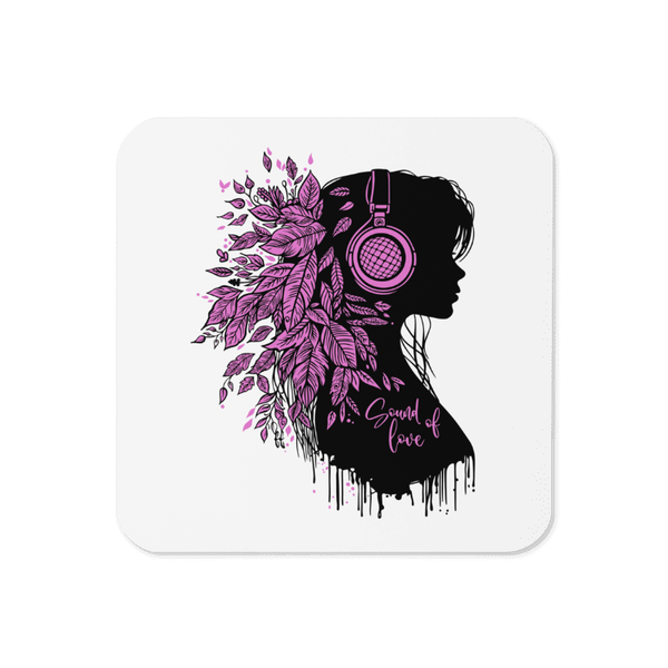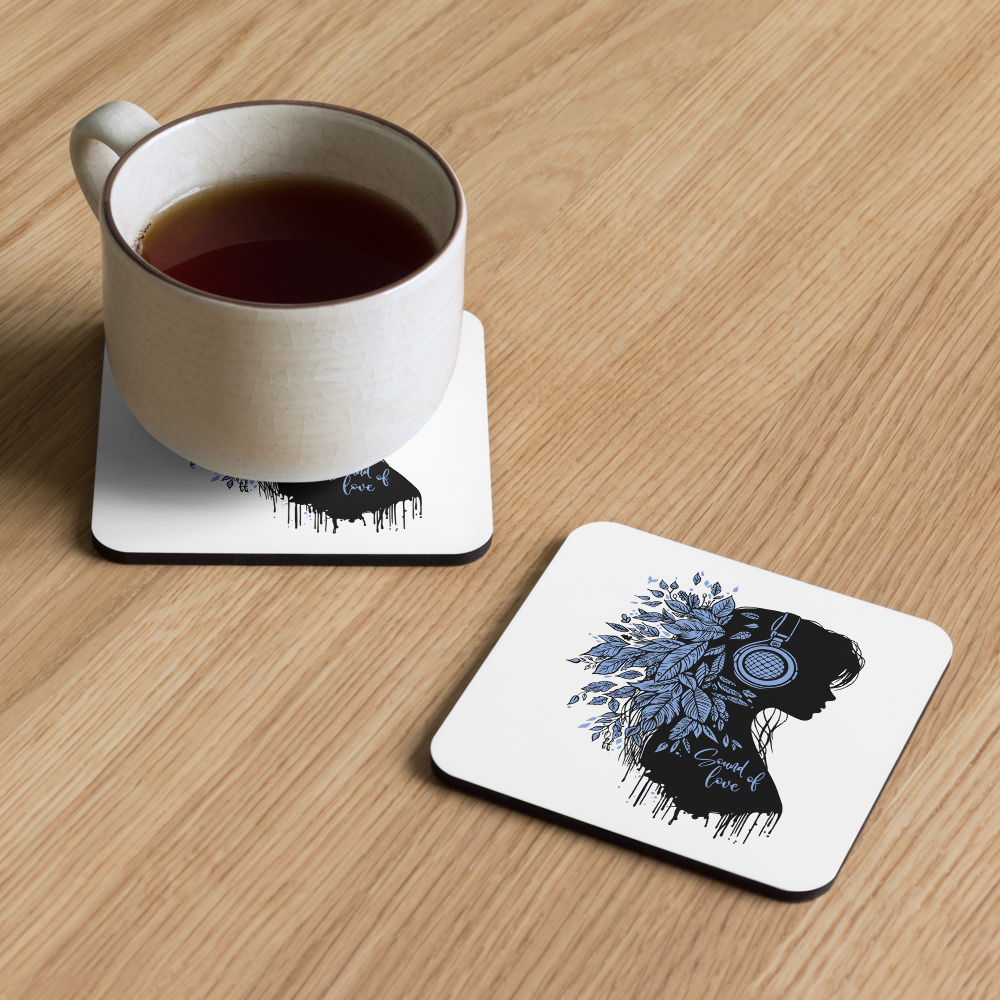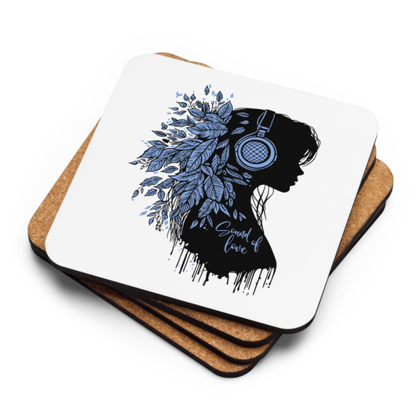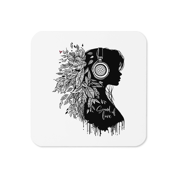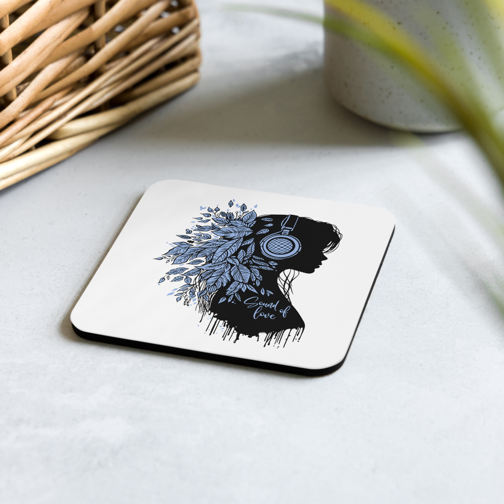 Dieser hochwertige Korkuntersetzer ist nicht nur praktisch, sondern auch ein echter Blickfang. Das Motiv zeigt eine elegante Silhouette mit Kopfhörern, verziert mit filigranen Blättern, und den Schriftzug „Sound of Love“.