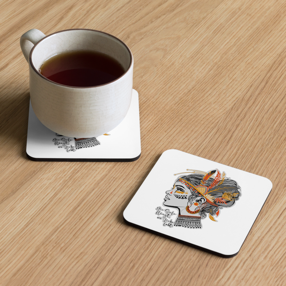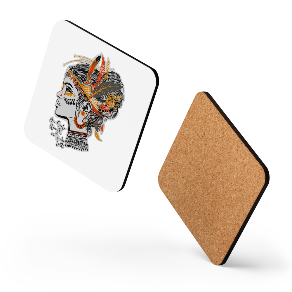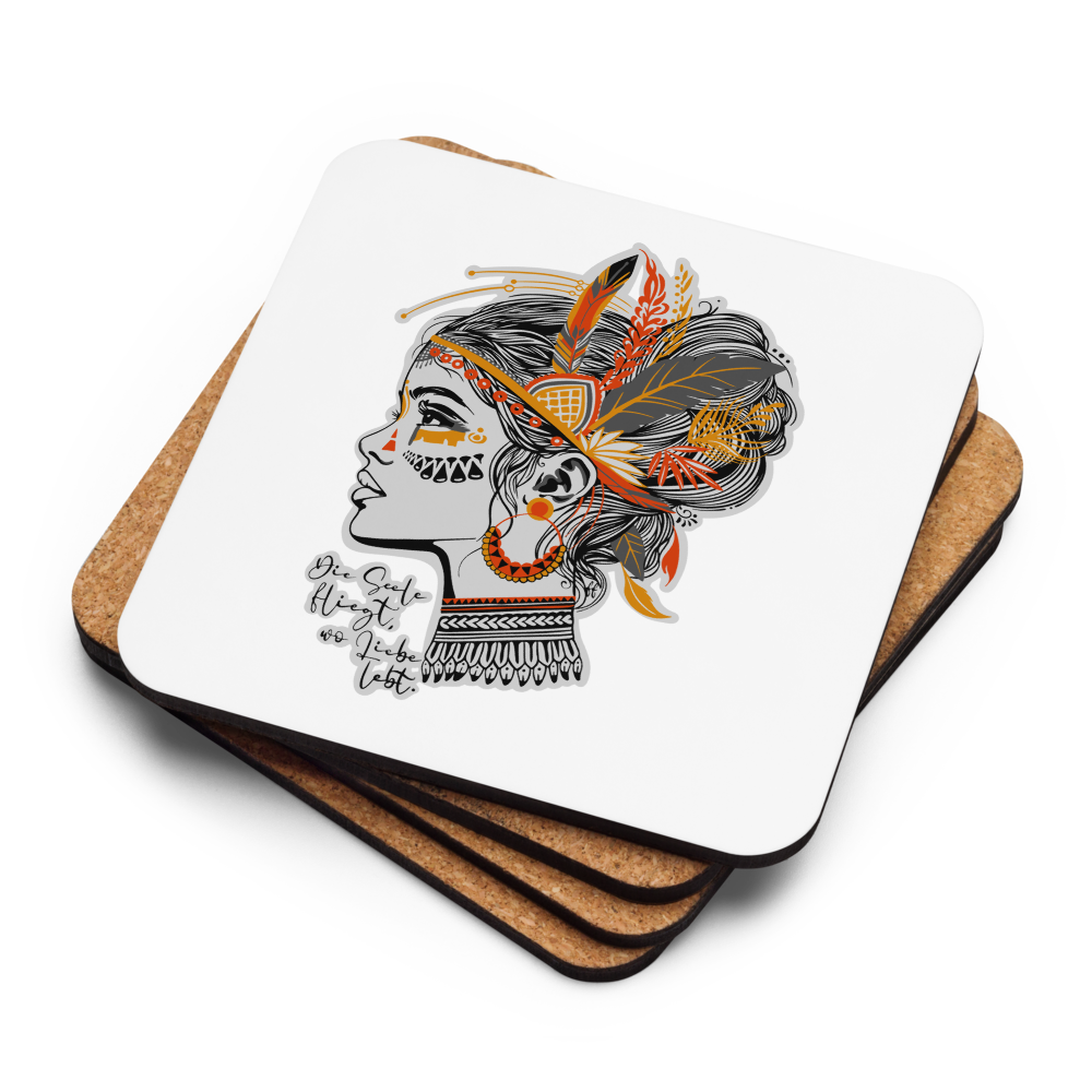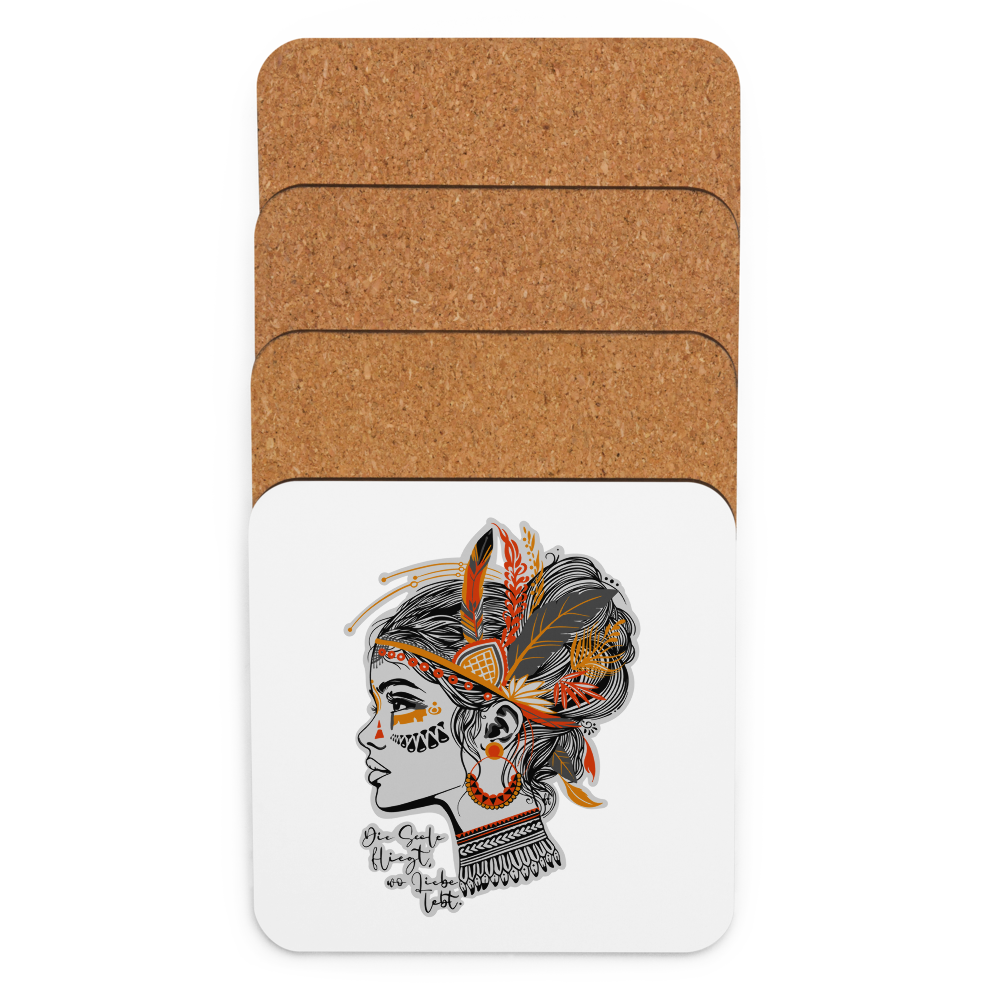 Korkuntersetzer Boho Frauenkopf „Die Seele fliegt“ – Federn im Haar, spirituelles Dekor & Geschenkidee | 4er Set