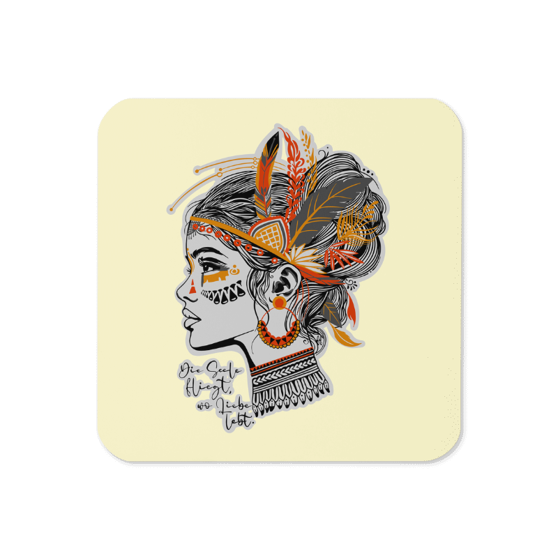 Unser Korkuntersetzer zeigt einen stilvollen Frauenkopf mit Federn im Haar und dem inspirierenden Spruch „Die Seele fliegt, wo Liebe lebt“. Ideal für Kaffee, Tee oder Gläser – schützt Oberflächen und setzt gleichzeitig ein spirituelles Statement. Perfekt als Geschenk für Freunde, Familie oder dich selbst.